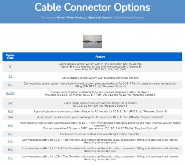 B Connectorizes sensor system with in-line connector. (D6, RC12 n/a). *Option B is also required for use with vacuum passthru flanges & assemblies Bv1, Bv2, Bv3, Bv4, BvF, BvW B1 Connectorizes sensor system with bulkhead connector (D6 n/a) Bv1 Connectorizes sensor system with single channel vacuum passthru hardware for 10 E-7 Torr. Includes ultra-torr compression fitting. (D6, RC12 n/a) *Requires Option B Bv133 Connectorizes Sensor System With Single Channel Vacuum Passthru Hardware Mounted in a 1.33″ CF Flange, for 10 E-7 Torr (D6, D12 and RC12 n/a) *Requires Option B Bv2 2 port single channel vacuum passthru flange for D models for 10 E-11 Torr (D6 n/a) *Requires Option B Bv3 3 port single channel vacuum passthru flange for RC models for 10 E-11 Torr (RC12 n/a) *Requires Option B Bv4 4 port dual channel vacuum passthru flange for D models for 10 E-11 Torr (D6 n/a) *Requires Option B BvF Multi-channel high vacuum passthru assembly for 10 E-7 Torr. Provides fused fiberoptic passthru and multi-channel vacuum flange assembly. Can accommodate 8 D type or 5 RC type sensors. (D6, RC12 & RC20 n/a) *Requires Option B Bw Connectorizes sensor system with wrench tight in-line connector. Fv1 Low vacuum passthru for 10 E-4 Torr. Provides solid section on fiberoptic cable, compression fitting, and stainless steel interlok sheathing on vacuum side. Fv2 Low vacuum passthru for 10 E-4 Torr. Provides solid section on fiberoptic cable, compression fitting, and stainless steel interlok sheathing on vacuum side. Fv3 Low vacuum passthru for 10 E-4 Torr. Provides solid section on fiberoptic cable, compression fitting, and stainless steel interlok sheathing on vacuum side. |